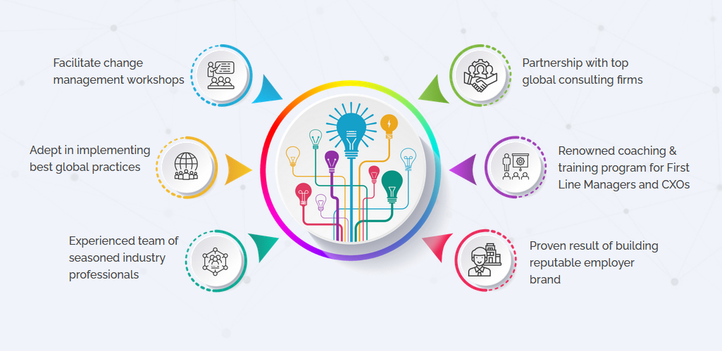 To provide strategic consulting to our clients that helps develop sustainable business practices with key focus on organization building, future readiness and leadership.